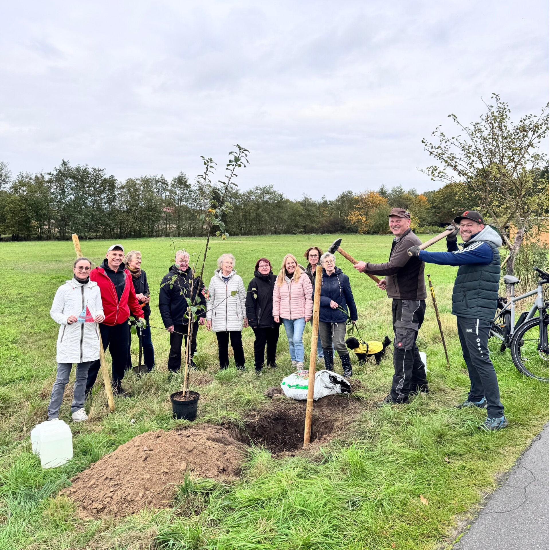 Der TVC Wahrenholz durch den Spielmannszug Wahrenholzer Isespatzen nominiert. So kam es, dass am 10. Oktober trotz leichtem Nieselregens zwölf engagierte Mitglieder mit viel guter Laune in die Apfelstraße nach Betzhorn kamen, um dort einen weiteren Apfelbaum zu pflanzen. Mitgebracht wurde alles, was ein Bäumchen zum guten Anwachsen braucht: Pflanzerde, Pfähle, die dem jungen Baum künftig Halt bei Wind und Wetter geben, sowie jede Menge Wasserkanister für die erste kräftige Bewässerung.
